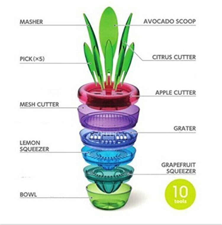 10 Tools: 1.masher, 2.picks*5, 3.Mesh cutter, 4.Lemon queezer, 5.bowl, 6.Avocad scoop, 7.Citrus cutter, 8 .Apple cutter, 9.Grater, 10.Grater squeezer
