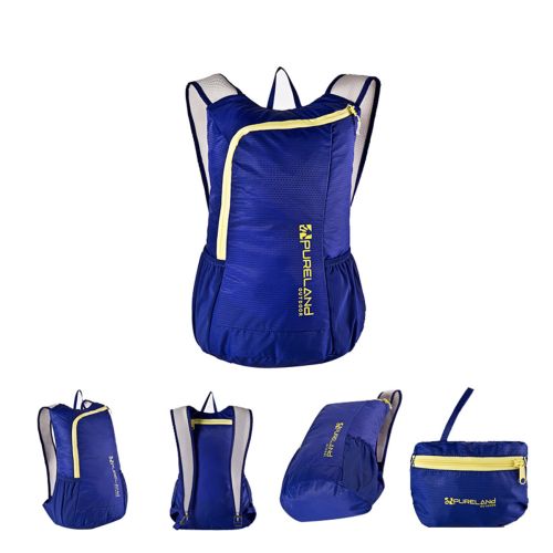 Open the port fold the backpack into the bottom the bag then push them into bag of finally zip it up.