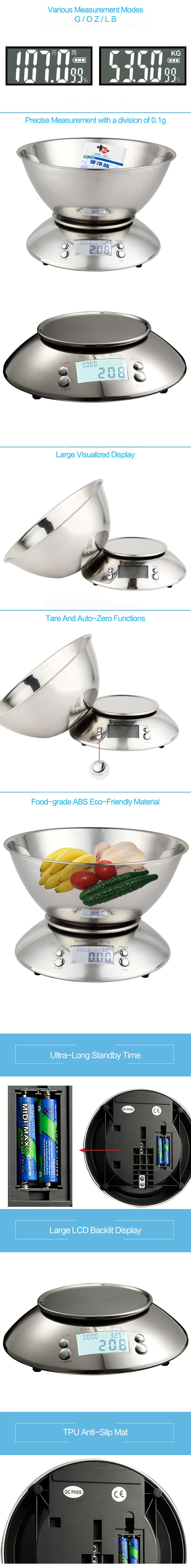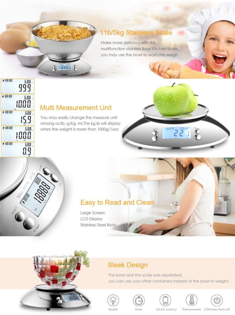With a weight capacity of 11 pounds (5 kilograms) and graduation of 0.1g, this KT digital kitchen scale has the accuracy to meet your personal and commercial needs. The compact and lightweight design makes it ideal for homes, kitchens, offices, mailrooms, and more. The scale clearly displays measurement results in kg(g), lb(oz), fl oz, and ml and ml on the digital LCD display. It was designed with a removable bowl, great for measuring mixed ingredients and tare measurements. When not in use, the bowl can be flipped upside down and placed over the scale unit to be used as a protective case, making it easy to store without taking up too much space. Save energy and simplify your life without lifting a finger.