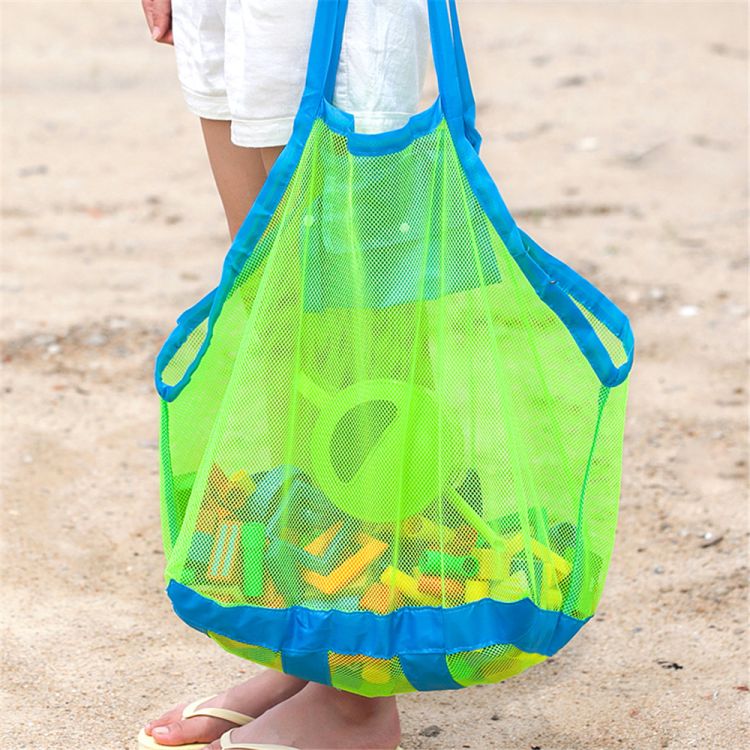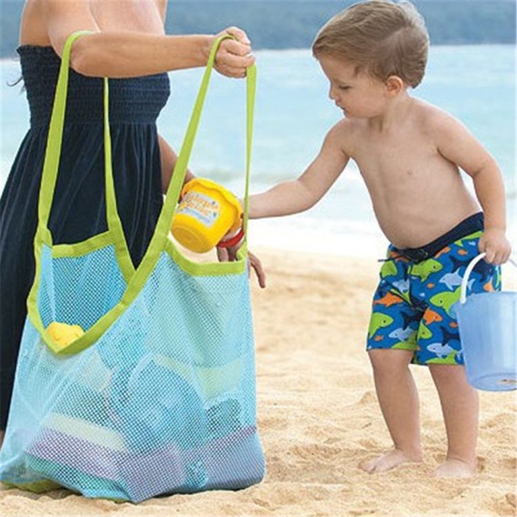 Children are playing out on the beach at ordinary times, a lot of things, sand dredging tools, towels, clothes, toys are scattered,the beach storage bag all receive them up.