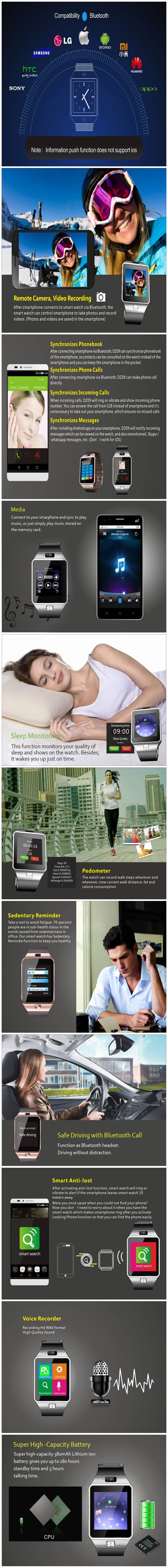 Function: Bluetooth Dialer, Messaging, Phonebook, Call center, Romote notifier, Remote capture, File manager, Image viewer, Calculator, Alarm, Sound recorder, Camera, Audio player, Profiles, Clock, Anti-loss, Pedometer, Sleep Monitor, Sedentary Reminder, Calendar, Support Facebook/Browser/Twitter/Whatsapp