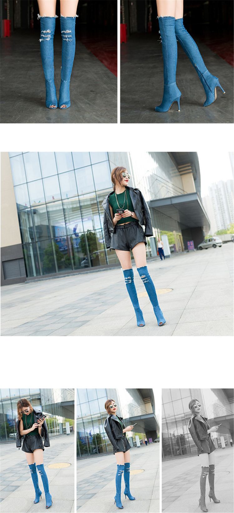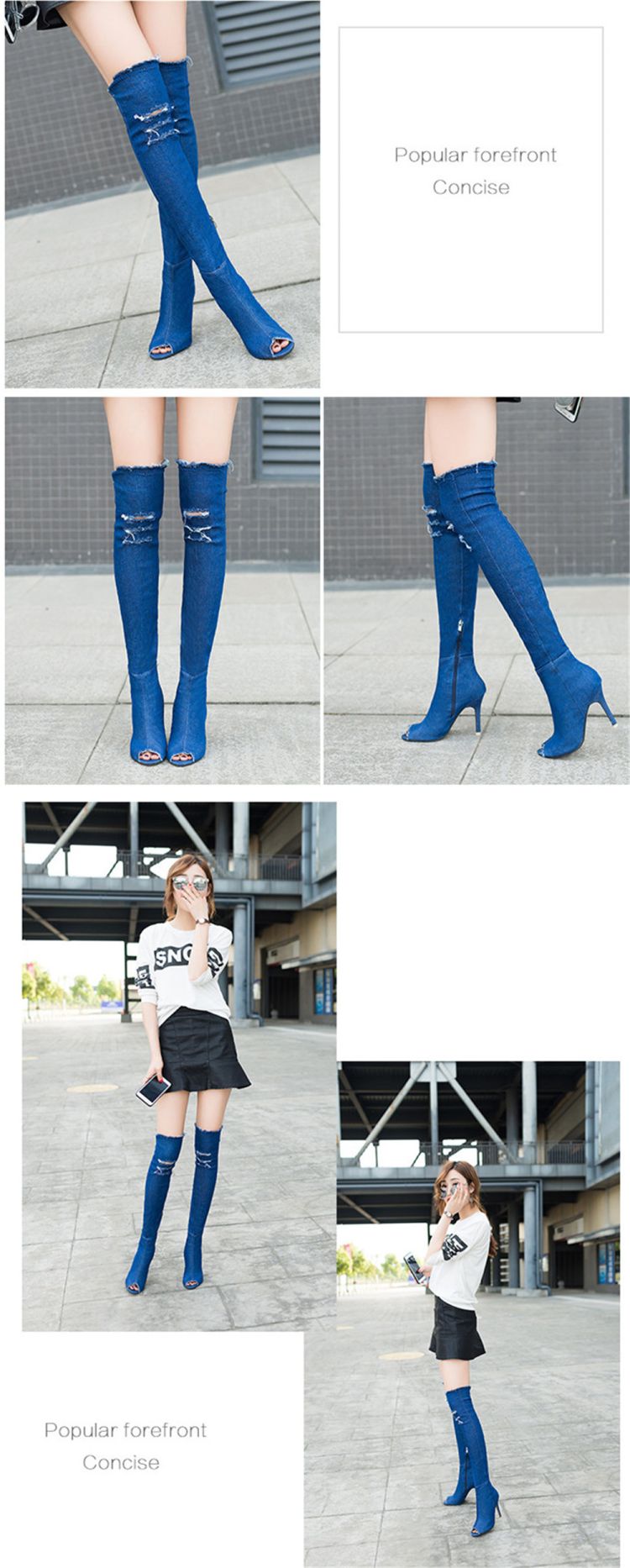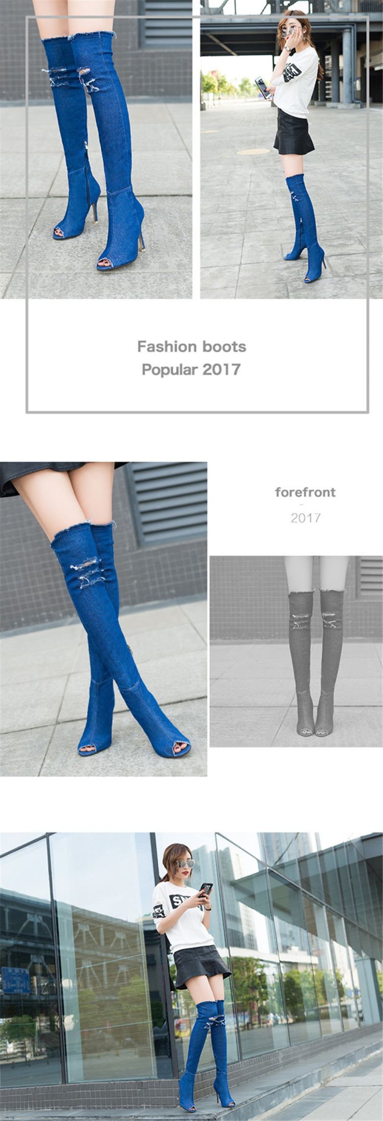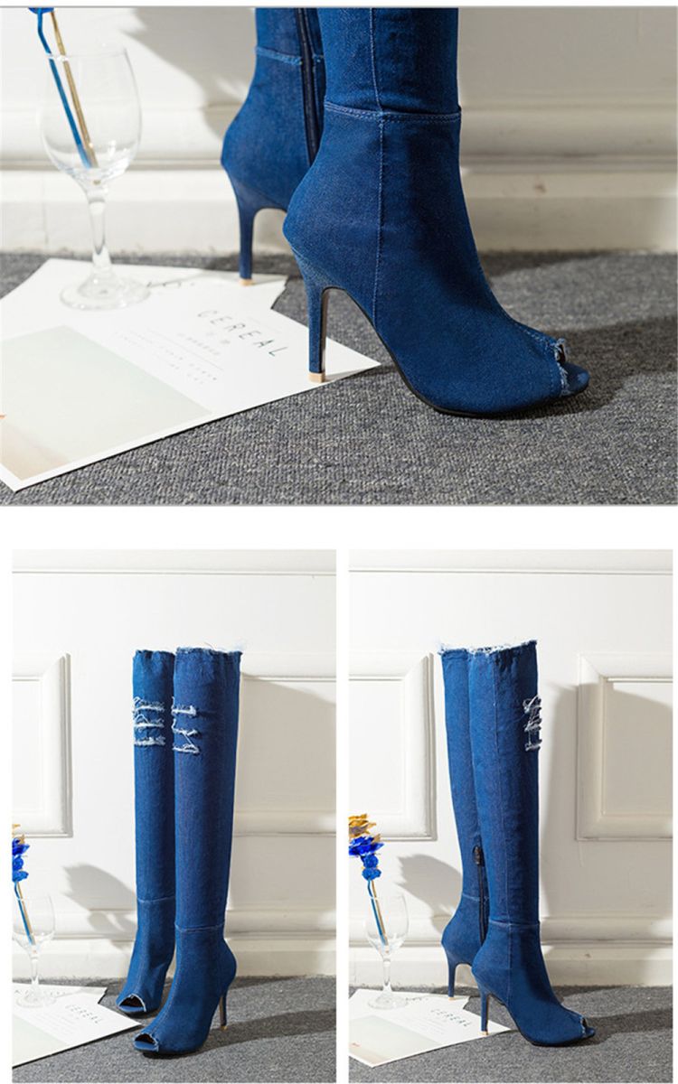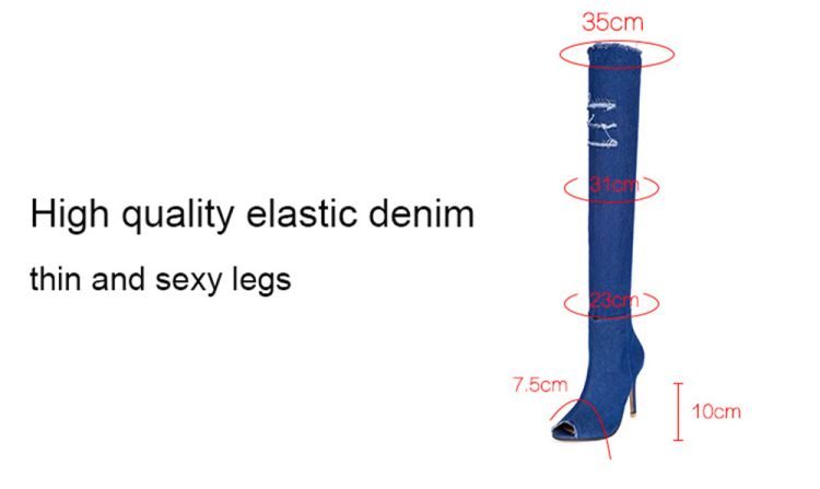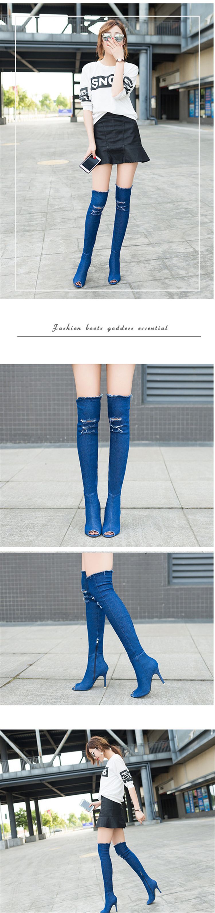 Do you want to have a pair of eye-catching comfortable boots when you are shopping or dating? Our Thigh High Over Knee Stretch Denim Boots is all fashionable European style. The zip at the ankle flips easily open as you step in, then closes securely. The elastic denim shows off your fabulous legs curves. The solid heel and cushioned forefront ensure walking comfort.