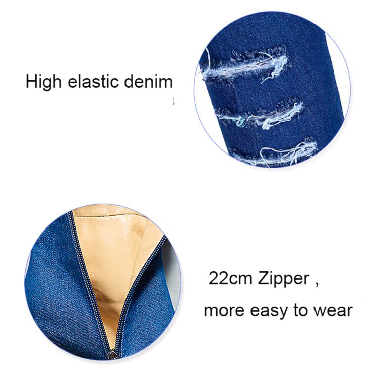 - High Stretch Denim Fabric, allows a large tolerance regarding different thigh measures and shows off fabulous legs curves.