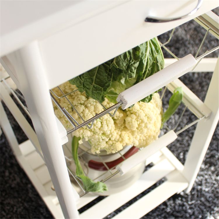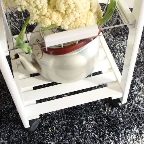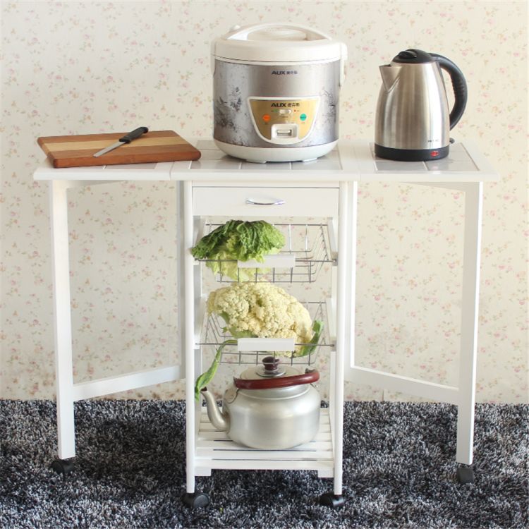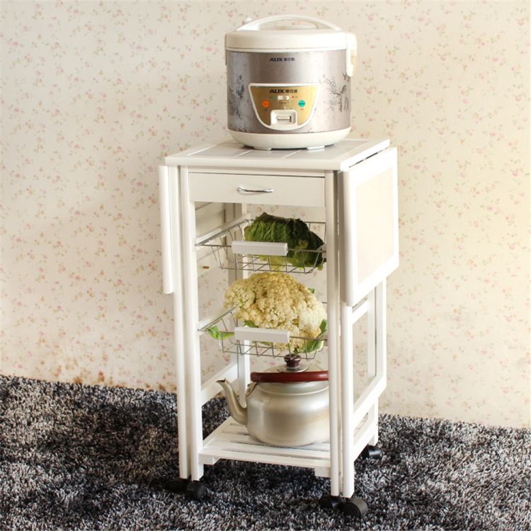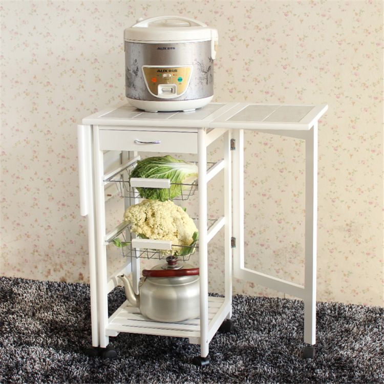 Spruce up your kitchen with this smart and compact designed Portable Folding Kitchen Rolling Tile Top Drop Leaf Storage Trolley Cart! It has a drawer, two baskets and an open shelf for simplified organization and easy accessibility. Four smooth, quiet spinner wheels make it a breeze to pull out or put away. Pull-out iron baskets are great for storing fruit and other kitchen utensils. Whenever you feel the need for additional space, simply open the two side panels with tiled surface. Its simple modern design will fit into a variety of home decor styles with ease. Click and order now!