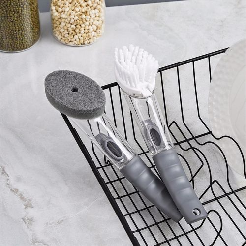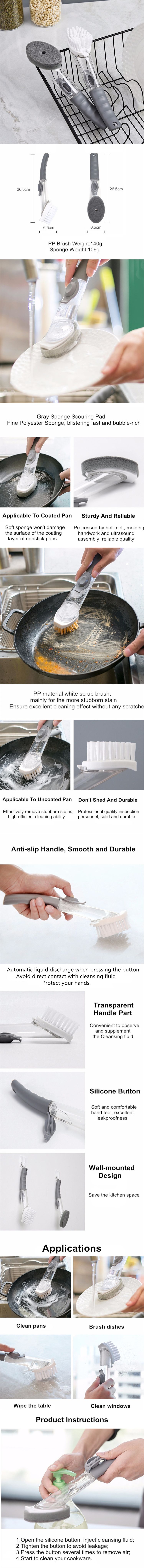 Is there any useful kitchen cleaning tool without dirtying hands? Here we recommend you the Portable Kitchen Cleaning Brush Set Washing Dish With Refill Liquid. The brush is constructed of plastic, with Nylon bristles. The brush fits into the palm of your hand and dispenses soap with the push of a button using air displacement. The ergonomic handle with a soft non-slip grip acts as a reservoir for the dish soap. Brush heads are removable and replaceable, so you can always have a fresh brush when you need it.