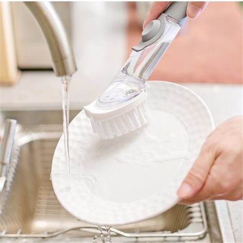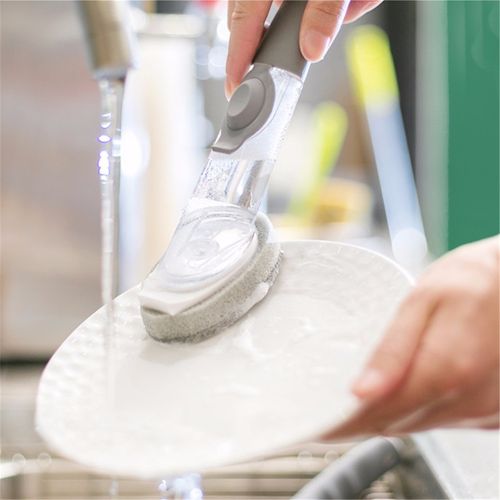 - The ergonomic handle with a soft non-slip grip also acts as a reservoir for the dish soap.