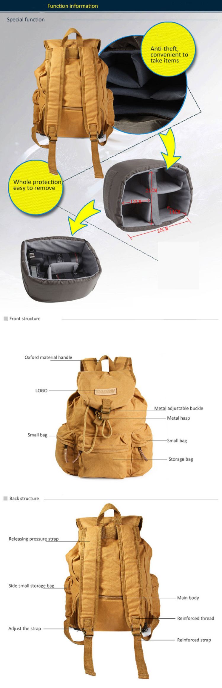 Package Contents: 1 x Canvas Backpack , 1 x Inner Bag, 1 x Rain Cover