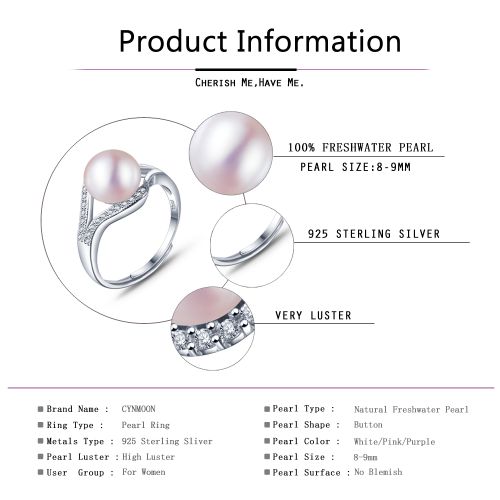 CYNMOON Sterling Silver Simple Freshwater Cultured Pearl Ring Pink White Purple Pearl Wedding Ring