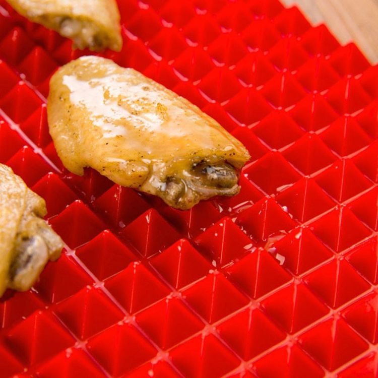 Being placed atop a pan while cooking or baking, those pyramid-like bumpy ridges help draw oils and enhance heat flow, browning without having to turn, which allows the food to be crisper.
