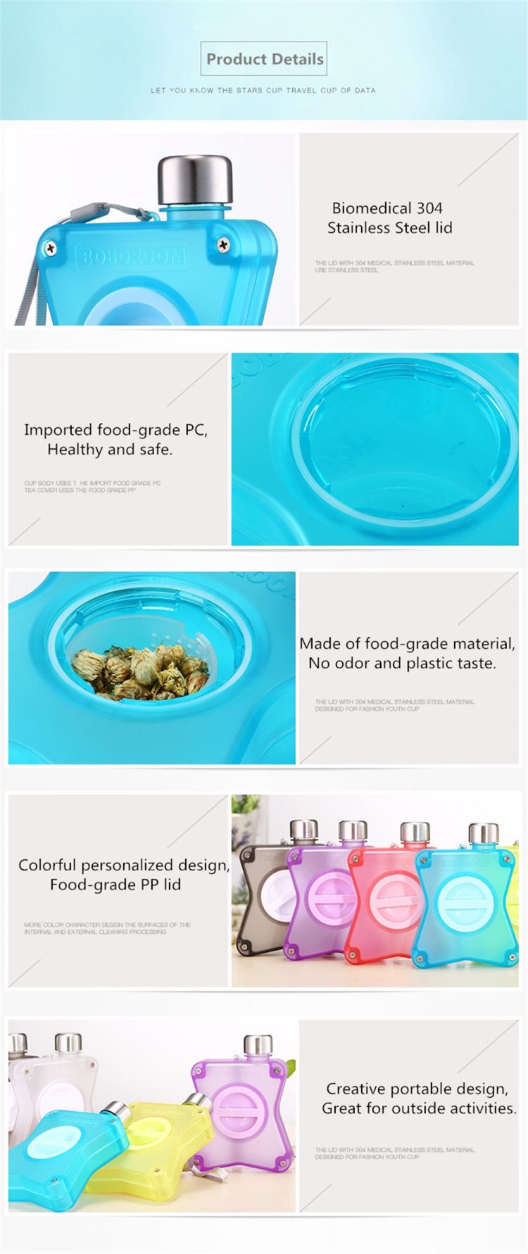 - Healthy And Safety: The water bottle is made of healthy and safety PP/PC material and 304 Stainless steel lid, FDA Approved, BPA free, safe and free of odor or plastic taste.