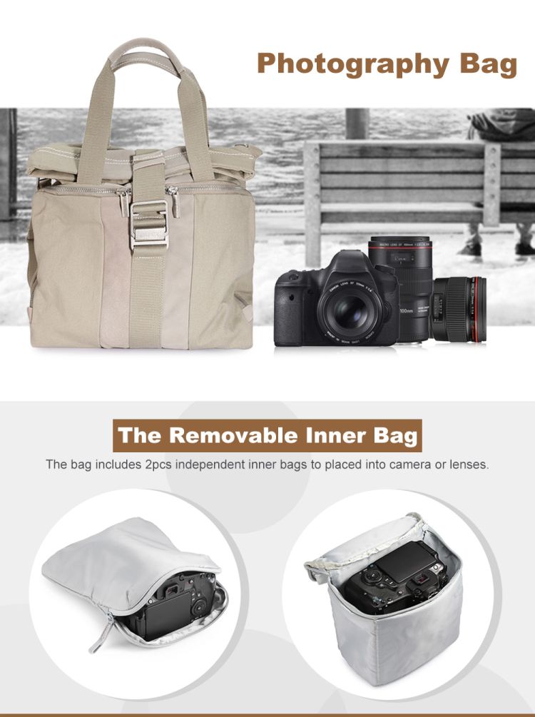 The bag includes 2pcs independent pockets to placed into camera or lenses