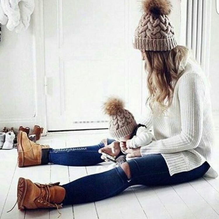 2Pcs Women Mother Baby Child Warm Winter Knit Beanie Fur Pom Hat Crochet Ski Cap