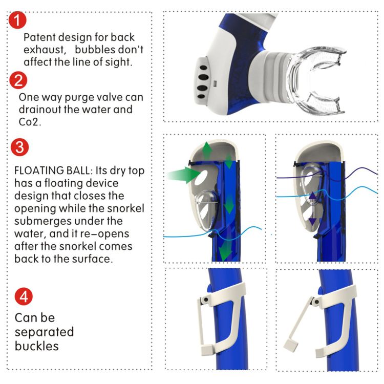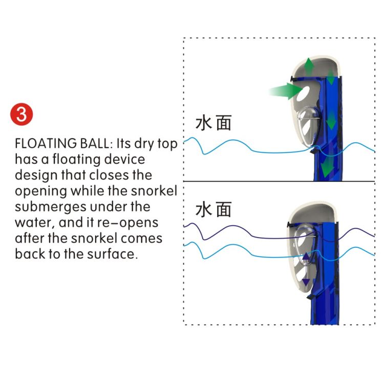 Its dry top has a floating device design that closes the opening while the snorkel submerges under the water,and it re-opens after the snorkel comes back to the surface.
