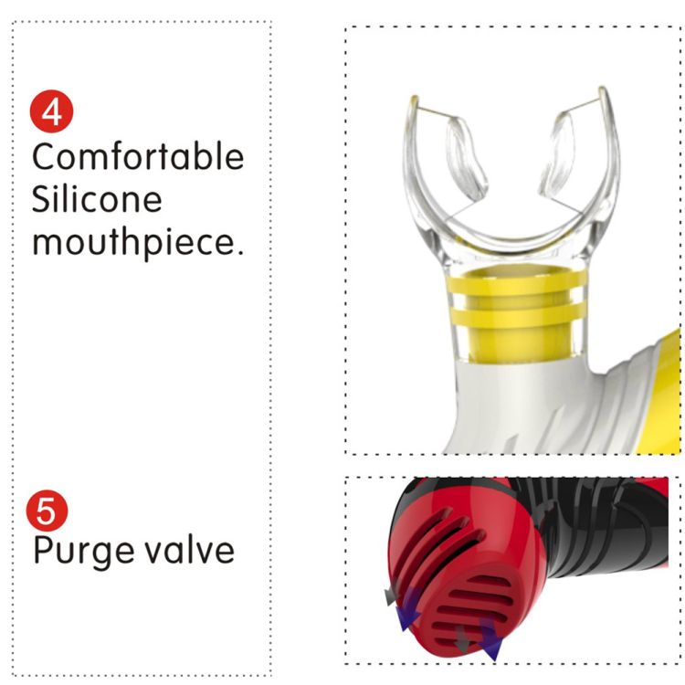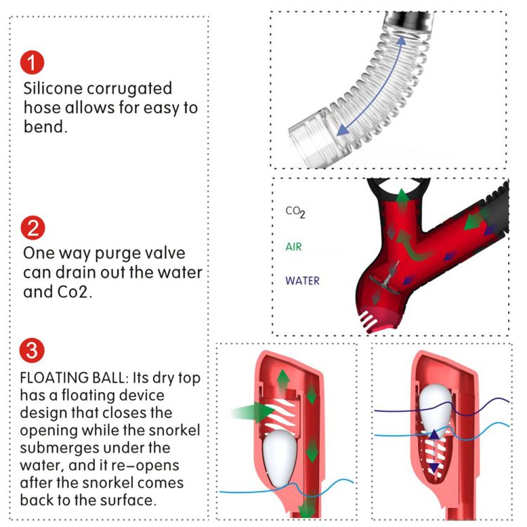 Its dry top has a floating device design that closes the opening while the snorkel submerges under the water,and it re-opens after the snorkel comes back to the surface.