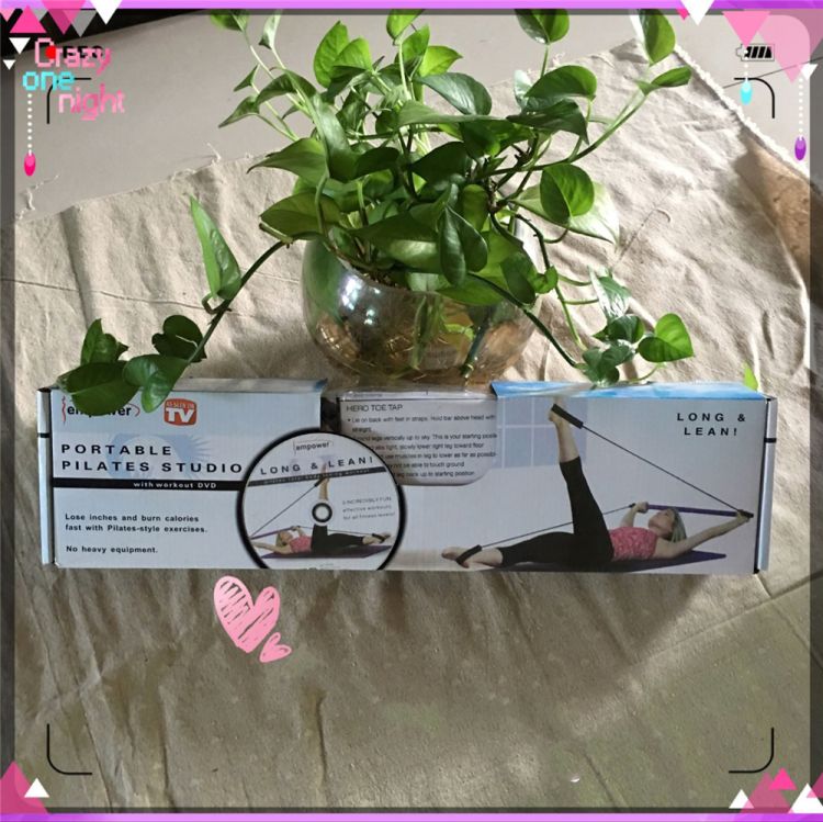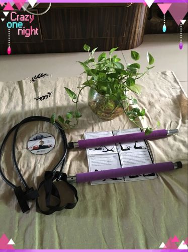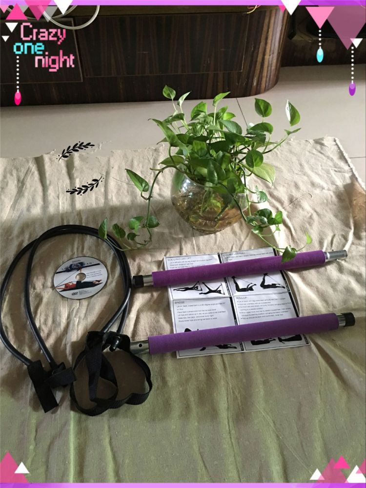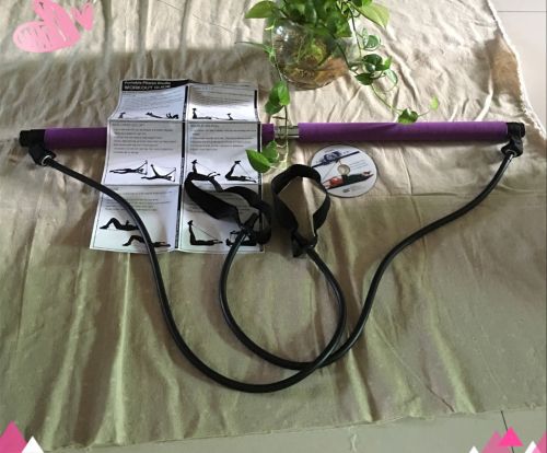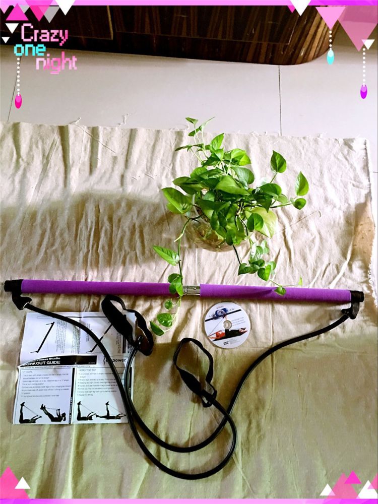 Includes Pilates bar with two power cords with attached foot loops on each side if the bar with workout DVD.