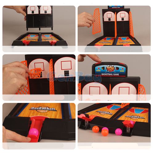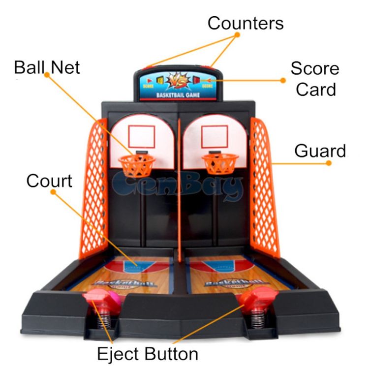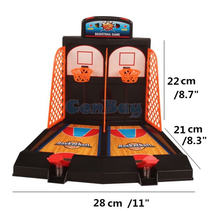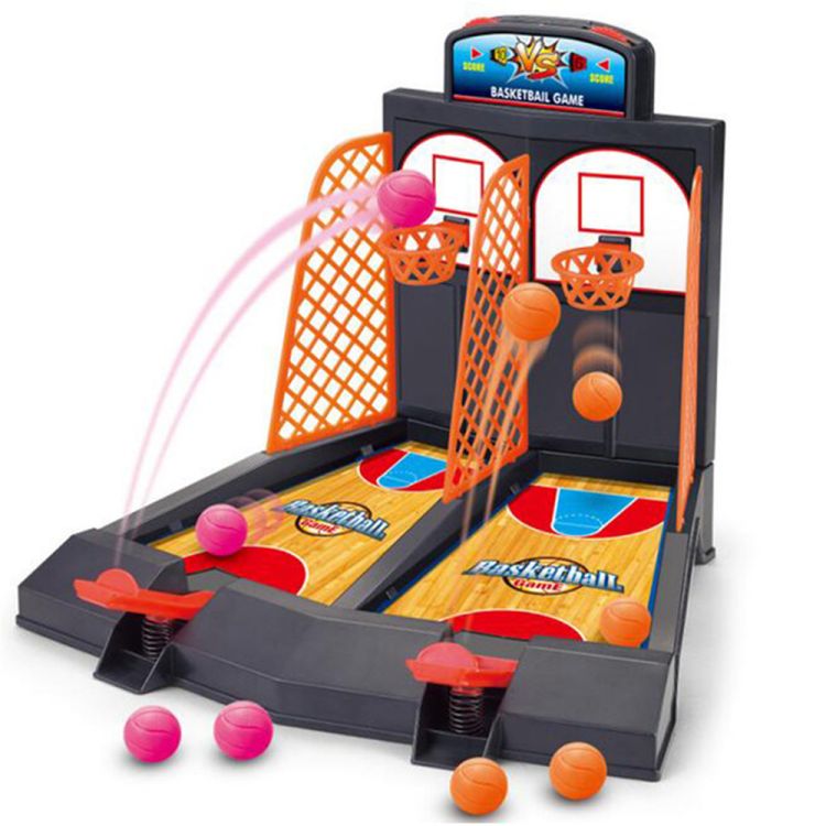 Indoor fun with 2-player table basketball includes built-in score keeper.
