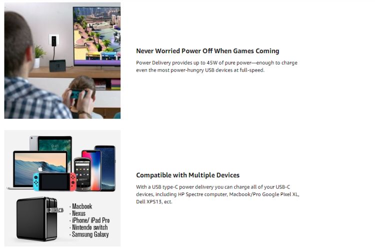 Output: USB-C receptacle, Power Delivery (PD) 5V/3A, 9V/3A, 15V/3A, 20V/2.25A