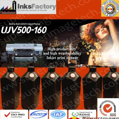 Printers Compatibility: Mimaki UJV500-160 Aliases: Mimaki UJV500 UV Curable Inks. UV Curable Ink for Mimaki UJV500-160 Package: 1000ml/bottle, UV Curable Inks/LED UV curable inks. Brand Name: SuperImage Origial of Certification: Made In China Country of Origin Main Raw Materials: Japan & USA; USA; USA Main Colors: Cyan, Magenta, Yellow, Black, Light Cyan, Light Magenta. Other Colors: White, Glossy Varnish, Clear, Cleaning flush for option. Work under LED UV lamp, LED Lamp, LED UV dryer, or other LED UV equipment, or Cold light source, etc. No odor, Really environmental-friendly, and safe inks. 'Touch dry' technologies adopted, with quick dry speed, and high fluency.gh fluency. Applicable Print Media: Mainly for Glass, Wood, Acrylic, Porcelain, Ceramic tile, covers, Mobile Covers, Metal, Plastic, KT Board, Marble, Stone, Foam, PVC, etc. Also for some banner, cloth, vinyl, wraps, flex, PVC, etc roll media need to printed by UV. Certifications & Standards:dards:ards: Top quality, Wide applicability, with RoHS standard & EN71 Safety Certification.ation.tion. No odor, Really enironmental-friendly Mimaki UJV500 LED UV Curable Inks, ISO9001-9002 Standard Main Points: 1). Excellent outdoor warranty, more than 36 months; 2). Excellent color saturation; 3). Precision filtration warrants clogging-free operation. 4). Several color matching sets producing accurate colors and wide gamut. 5). Faster drying giving improved productivity. 6). Safe resin and additives materials and water solvent for a better environment. 7). More light smell, mostly no odor. 8). Main Resin, Photoinitiators, colorants, additives material brand: CIBA 9). High stability and No Color distortion. 10). Good scratch-resistance, and firmness onto the prints 11). Low energy consumption, save printing cost. 12). Consistent quality & reputation.tion.tion. Quality Warranty: SuperImage affords full quality warranty for our inks products. For any inferior quality products or loss caused by inferior quality inks, SuperImage will be responsible for products-changing, returning and replacements delivery, as well as related compensation.