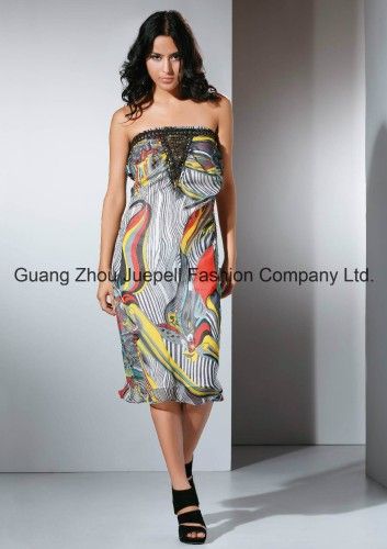 Product Information: Chifon metal accessory Abstract Print Strapless dress 1.Model No.: 2012QZ007 2.MQC: 300 PCS 3.Fabric: Woven 100% Polyester 4.Color:Many option 5.Quality: High Quality 6.Packaging: 1 PC/Polybag with hang tag or in accordance with client's request 7.Mode of Transportation: By sea or air 8.Sample Lead Time: 5-7 days via DHL, TNT, FedEx,UPS 5-10 days via EMS 9.Delivery Time: 25 days after the PP sample confirmed