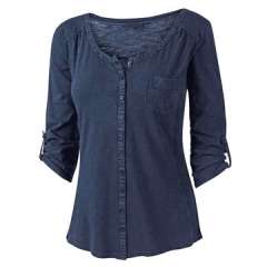 女士休闲衬衫,编织纱染色棉,补丁口袋与按钮,V领