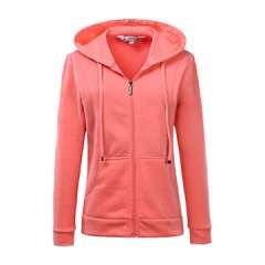 女式拉链连帽衫采用47.5%涤纶,47.5%棉,5%氨纶,设计简单