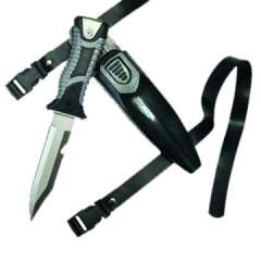锋利的水肺潜水刀与防滑不锈钢手柄。长度27厘米在护套。