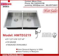 32'X19'不锈钢顶盖等量双碗手工厨房水槽