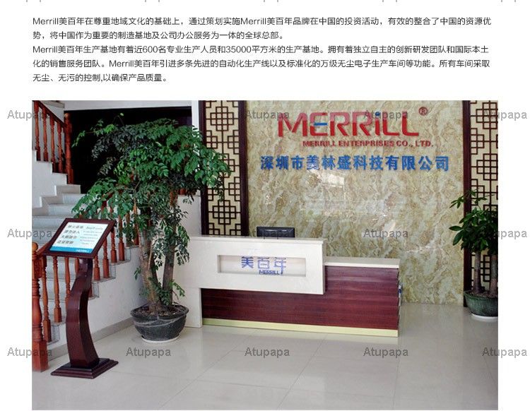 深圳市美林盛科技有限公司致力于汽车电子领域产品研发制造及销售服务于一体的创新型国家级高新企业, 是一家有着10年经验的能够提供带来更好的体验和更安全驾驶感受的记录设备解决方案及产品的一站式供货商. 美林盛为德国MERRILL ENTERPRISES CO., LTD投资管理的中国制造企业, 在中国深圳有着近600名专业生产人员和35000平方米的生产基地, 拥有着独立自主的创新研发团队及国际本土化的销售服务团队. 我们起初作为OEM/ODM制造商和全球供货商, 致力于行车智能辅助系统及智能分享终端等功能的记录设备的设计和生产, 现在我们已经能够很专业的提供给客户大量的产品和完善的销售方案及服务. 美林盛于2013年在中国完成了 'Merrill美百年' 的品牌注册. Merrill美百年的产品以其精巧的外形, 性能的稳定, 适配性高, 更好的体验及分享便携等强大实用功能赢得客户和消费者的青睐, 成为中国汽车电子行业的创新型主流品牌, CCTV推荐品牌. 凭借大量具有医学背景及艺术背景的研发团队和严谨的制造管理, 我们确保了产品的交货时间和顾客对产品的满意度. MERRILL美百年所有产品均拥有自主的知识产权, 且品牌已经在全球完成了注册. 我们的产品符合3C, PSE, CB, UL, ROHS, FCC, CE及BQB之等国际标准. 完善的质量体系, 环境体系和社会责任体系一直是我们引以为傲的, 且在同行业中被视为翘楚和模仿的对象, 工厂曾历经一些质量严苛的客户的稽查, 得到了客户的嘉勉和赞赏, 而全面导入实施ISO 9001: 2004&ISO 14001: 2008&ISO/TS16949:2009及OHSAS18001:2007等国际体系标准, 确保了企业各个政策及理念的实施和推行. Merrill美百年一直在探索与思考, 怎么让产品更懂你, 在大数据到来的时代里, 让一切变得更简单. 在未来, Merrill美百年将会开创中国高端记录设备的互联时代. 我们只致力于创造一个更先进, 更安全, 更好体验的汽车社会.