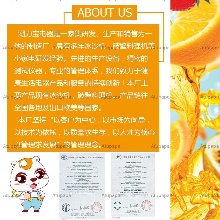 佛山市顺德区潮力宝电器有限公司是一家集研发, 生产和销售为一体的制造厂, 具备多年冰沙机, 破壁料理机等小家电研发经验. 先进的生产设备, 精密的测试仪器, 专业的管理体系, 我们致力于健康生话电器产品和服务的持续创新! 本厂主要产品现有冰沙机, 破壁料理机. 产品销往全国各地及出口欧美等国. 本厂一贯坚持 '以客户为中心, 以市场为向导, 以技术为依托, 以质量求生存, 以人才为核心, 以管理求发展' 的管理理念, 为客户提供优质的产品, 专业的服务, 持续为客户创造价值.