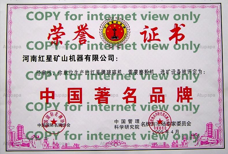 In 2001, Hongxing Brand mining machinery has passed the authority test detected by the State Department and been rated as Products with Standard quality and Assured brand'. In December 2003, we obtained the certificate of Qualified Products by the National Quality Inspection. In April 2005, Hongxing Brand is rated as Chinese famous brand'. All products have passed the authentication of ISO9001. In addition, we have been awarded Civilized Enterprise', Key Enterprise', Enterprise with Standard Quality and Enterprise with Honesty and Credit Standing successively.