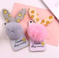 新款日韩iphone7兔毛球手机壳 | 苹果6PLUS笑脸兔子毛绒壳批发