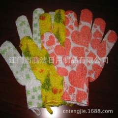 各款印花图案的五指绵纶, 尼龙沐浴手套, 厂家定造.