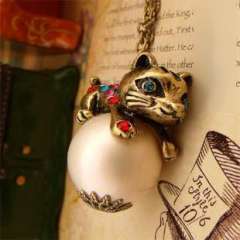 2798 韩版 | 长款 | 优雅可爱猫咪镶钻珍珠 | 项链毛衣链 | 元旦礼物 | 女