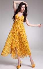 大V领收腰开叉蛋糕边 | 大摆真丝雪纺连衣裙 | 大码 | 黄色