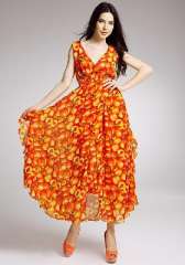 大V领收腰开叉蛋糕边 | 大摆真丝雪纺连衣裙 | 橘红色