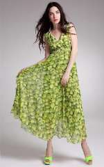 大V领收腰开叉蛋糕边 | 大摆真丝雪纺连衣裙 | 绿色