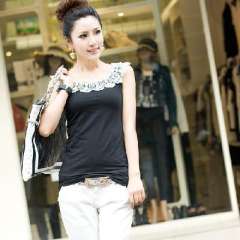 韩版钩花边圆领打底背心\布蕾丝雪花打底衫-黑色