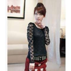 立体 | 袖镂空 | 雕花长袖蕾丝打底T恤 | 全棉质 | 黑色