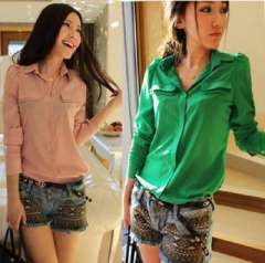 2013新款春夏新款韩版女装欧美风纯色大口袋雪女士纺衬衫 | 衬衣cy29