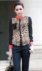 2013新款韩版立领垫肩红领撞色雪纺豹纹衬衫女士长袖衬衣