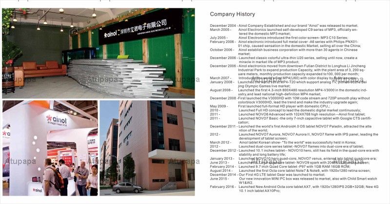 Shenzhen Ainol Electronics Co., Ltd is a leading mobile internet portable device manufacturer with more than 16 years experience, is a private high-tech enterprise with scientific research, development, production and sales. Ainol is specialized in tablet PC and other digital consumer products, with 200 workers and more than 4200 square meters of production plant professional test line& innovation team. At the same time, we provide OEM/ODM service of all kinds of mobile digital products for outstanding foreign brand according to customers requirements.