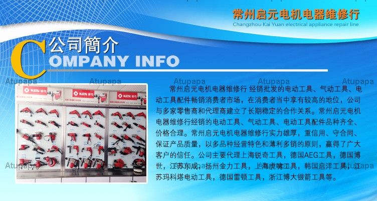 Changzhou Kaiyuan electrical electrical repair line of wholesale distribution of power tools, pneumatic tools, power tool accessories best-selling consumer market, consumers enjoy a higher status, the company with a number of retailers and agents to establish a long-term and stable relations of cooperation Changzhou Kaiyuan electrical electrical repair line distribution of electric tools, pneumatic tools, power tool accessories range, reasonable price. Changzhou Kaiyuan electrical electrical repair line strength, credit, keep the contract to ensure product quality, multi-species operating characteristics And the principle of small profits but quick turnover, won the trust of our customers. The company mainly agents Shanghai Ruiqi tools, Germany AEG tools, Germany Bosch, Jiangsu East into, Yangzhou Jinli tools, Shanghai Tigers tools, Korea Kai foreign tools, Jiangsu Ma Kota power tools, Germany Leiden tools, Zhejiang broad silver arrows tools.