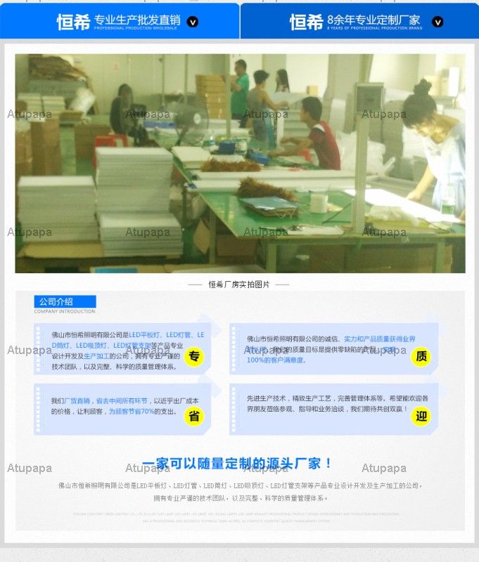 Foshan HengXi Lighting Co., Ltd is a professional LED lighting company which is specialized in design, development, production and processing of LED flat-panel light, LED tube, LED downlight, LED ceiling lamp, LED lamp holder, etc., with professional and rigorous technical team. The quality management system. Foshan Heng Xi Lighting Co., Ltd. integrity, strength and quality of products recognized by the industry. Our quality goal is to provide zero defect products to achieve 100% customer satisfaction, and hope to welcome friends from various circles to visit , Guidance and business negotiations, we look forward to creating a win-win!