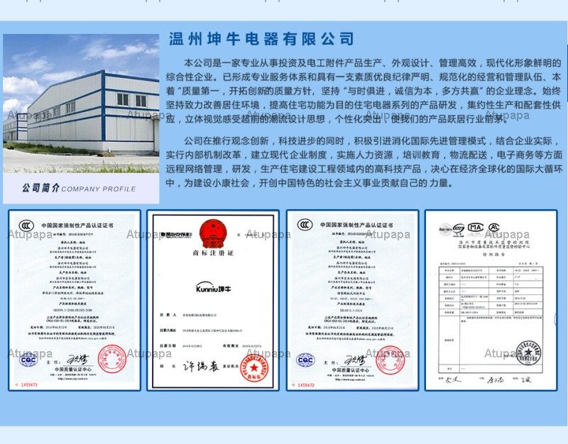 Wenzhou Kunniu Electric Appliance Co., Ltd. is a professional manufacturer of wall switch and accessories, switch panel, wall switch, switch socket and so on.We have a complete and scientific quality management system.Wenzhou Kununiu Electric Co., Ltd's honesty, strength and product quality The company adhere to the 'truth-seeking, pragmatic. Efficient, dedicated' approach to business, strict quality assurance system, in the new century, we will follow the 'innovation, innovation and innovation', the company's business philosophy, , Enterprising, rigorous, pragmatic 'purpose and to' good quality, excellence 'forge ahead entrepreneurial spirit, supremacy of products, quality service for your business off-wing. Carefully do a good job every product, the supremacy of Quality, high efficiency, Wenzhou Kun Niu Electric Co., Ltd. will be a dedicated attitude, the spirit of dedication, skilled practice, a good reputation into the details of the service. Products and services are more perfect in the table, credibility , Quality and efficient service has always been our goal.