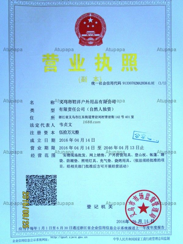 YiWu JunYang Outdoor Products Co., Ltd. Is located in Yiwu City, Zhejiang Province, China International Trade City G District, second floor, 15245 position, is a camping equipment, climbing sticks, multi-functional tools, outdoor life-saving supplies, headlamps and outdoor leisure products and other products With the number of retailers and agents to establish a long-term and stable relations of cooperation. Reasonable prices. Credibility, keep the contract to ensure product quality, operating characteristics of multi-species and the principle of small profits, won the The majority of customers trust.