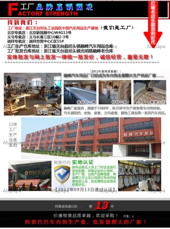 Melting peak auto supplies plant originated in 1988, is located in China drunk big automotive production base----Zhejiang Tiantai. The registered capital of 3 million, Ali Member 13, has more than 28 years of experience in export and domestic markets. Specializing in the production of car seat covers seat covers, Sun block, steering wheel covers, foot pad Kit series of auto accessories such as jewelry, wholesale agent factory direct supply of low price thing, your satisfaction is the melting peak of pursuit! Owns CHE AI REN (wife), STAR PARTNER (Star Partner), RF (melting peak), Racing (r) and other well-known brands! Factory formerly worked for Germany VW, BMW's global automotive interior products specified processing production, we are now set up for 80duowanliang vehicles a year for supplies supporting the physical plant, and its products sell well in domestic provinces and cities, and exported to Europe, the Middle East, South Africa, Japan, Korea, Southeast Asia and other countries, both in the domestic and international automotive industry enjoys a high reputation and praise! Before credit plant until 2020 to create walk drunk ship factory of car interiors, and moderately priced small profits but quick turnover, Oh. Domestic wholesale customers:-----"we support online ordering! "★ Trade inquiry:-----" mailbox to the factory. ! "★ Companies annually participate in the export commodity fair held in Guangzhou, and actively participate in large-scale domestic and international hot spots for international automotive exhibition fair, bold to develop new markets, actively participate in international competition, products are well-received by international foreign, wholesalers, supermarkets purchase mission trust. Companies adhering to the ' people-oriented, contributing to society ' business philosophy, a commitment to ' quality first, the supremacy of ' business purpose, adhere to the ' sincere cooperation, endless ' concept, of hard work and hard work of all staff, continues to expand the scale, performance increases. Became a focus of local enterprises, and successfully passed the quality system certification system. Due to business and expansion of production scale, take off the melting peaks welcome to join! Import and export company or domestic trade customers are welcome to contact us, open up auto supplies markets! Melting peak is evolving at the same time, warmly welcome new and old customers to come to discuss cooperation. Official website: http://www.RF-CN.com second marketing network: https://car18188.1688.com/Alibaba: https://ttrf.1688.com wholesale customer service QQ:908880365