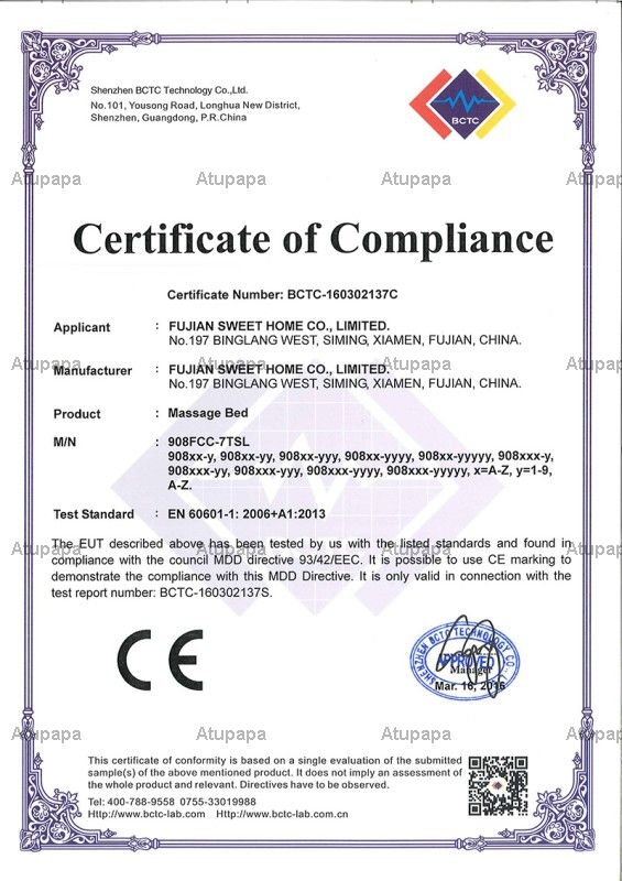 Fujian Sweet Home Co., Ltd located in Fujian Province, it is an enterprise holding consummate ability of research, manufacturing, marketing and perfect after-sale service. Our main products are: Body massager, massage bed/table, massage chair, massage mattress, massage cushion/pillow, foot massager, belt massager etc. Our products have been granted the international certificates such as CE and RoHS.