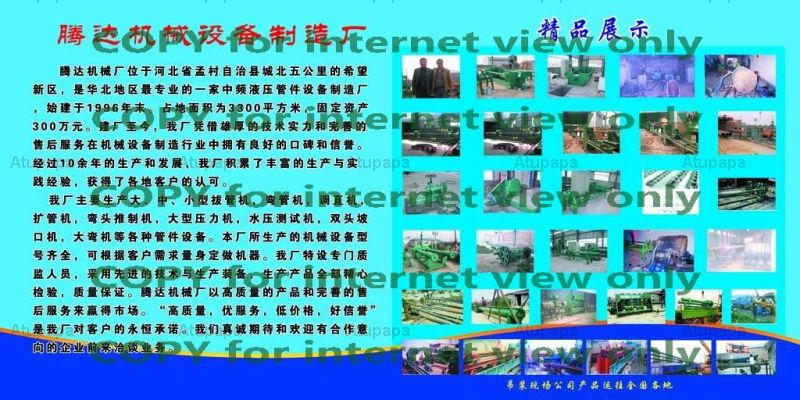 Cangzhou Tengda mechanical equipment factory is one of the hydraulic equipment manufacturer in North China professional. I plant the production of hydraulic equipment, by the majority of users praise and trust and has received a number of honorary certificate, the main products are if hydraulic tube expanding machine', if hydraulic pipe bender, hydraulic bend drawing machine, straightening machine, hydraulic pressure testing machine, pulling machine, grinding machine, double-headed chamfering machine, flange and rounding the machine, drawing machine, three high, intermediate frequency power supply.