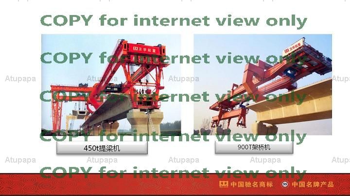 Henan Weihua Heavy Machinery Co., Ltd. Products leading products for all types of bridge, gantry crane, with production from the weight of 900t and the following general bridge, gantry crane capacity, particularly in the following 500t crane products have strong market competitiveness for the design and manufacture of many industries with high technological content, highly specialized lifting equipment, many of the products in the original design criteria of a larger improvement, optimization and innovation; 100-320t lifting double, double brake, four-beam structure High working-level, high-reliability metallurgy bridge crane; 80-250t powerhouse bridge crane with full frequency; remote control, all programmed to run garbage incineration power plant cranes; lifting capacity of 400t, large span, high lift , with a hull flip function shipbuilding gantry crane; tracks or tire container gantry crane; quayside container crane; gantry crane; transfer girder; 5-300t low headroom, low tire pressure bridge crane; super winch 400m tunnel gantry crane; with top spin or rotation function under various magnechuck crane; 50-100t slab tongs crane; 50-500t bridge machine; China's first all smart tank shock test machine and satellite launch center airlock drop test devices, fully reflects the company's product development and manufacturing capabilities. Henan Weihua Heavy Machinery Co., Ltd. The main products are widely used in machinery, metallurgy, electric power, railway, aerospace, port, petroleum, chemical and other industries, serve national water, natural gas, the Three Gorges Hydropower Station, the Jiuquan Satellite Launch Base, Qinshan Nuclear Power Plant, the Hangzhou Bay Bridge, Beijing Olympics and other national key projects and exported to the United States, Russia, Britain, Japan, Korea and other 56 countries Henan Weihua Heavy Machinery (Fitting) Limited production and sales gantry crane reelection first in the country, in 2011 sales revenue reached 4.843 billion yuan.